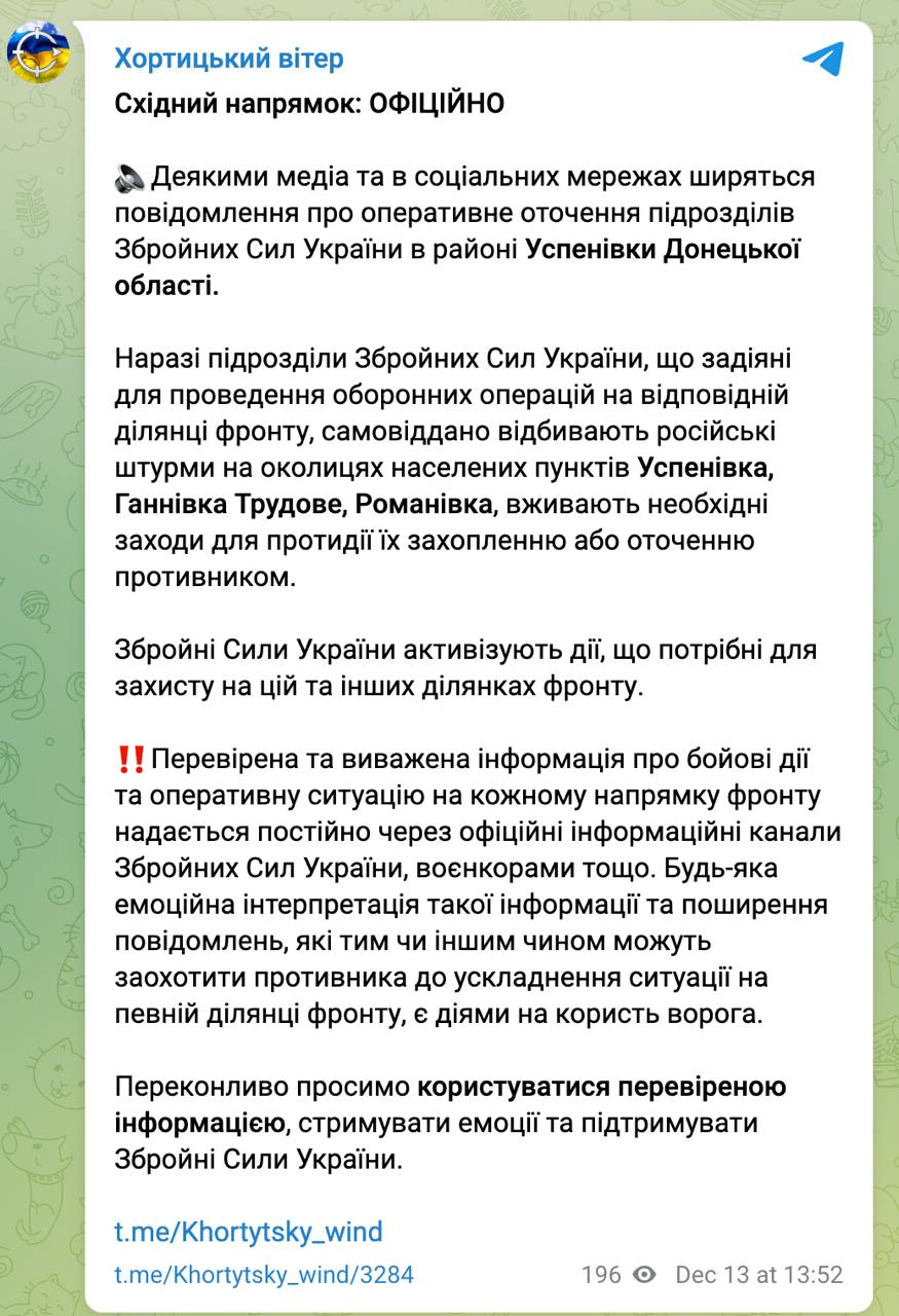 "В даний час підрозділи Збройних Сил України, які задіяні для проведення оборонних операцій на відповідній ділянці фронту, самовіддано відбивають російські штурми на околицях населених пунктів Успенівка, Аннівка, Трудове, Романівка, вживають необхідних заходів для протидії їх захопленню або оточенню противником", у повідомленні.