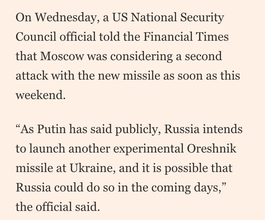 "Як Путін публічно заявив, Росія має намір запустити ще одну експериментальну ракету "Горішник" по Україні, і цілком можливо, що Росія зробить це найближчими днями", - заявило джерело в середу.