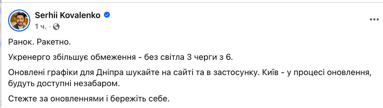 08:43 Через ракетні удари "Укренерго" збільшує відключення світла на сьогодні.