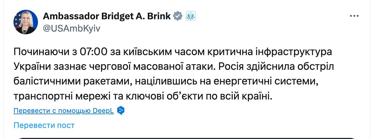 09:57 Росія атакувала ракетами не лише енергетику, але також транспортні мережі та "ключові об'єкти по всій країні", повідомляє посольство США.