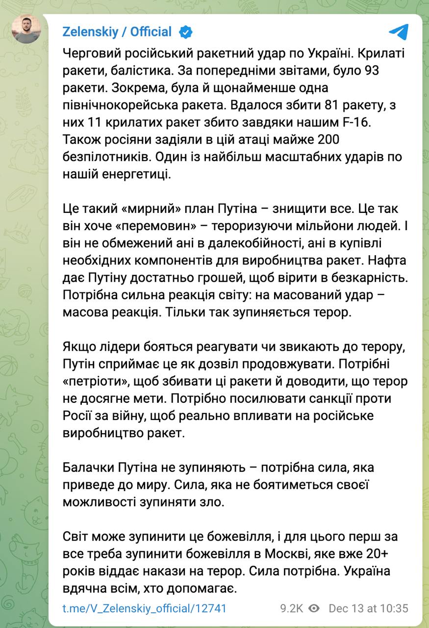 10:38 Президент Володимир Зеленський заявив про атаку 93 ракет і більш ніж 200 безпілотників.