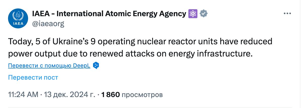 12:14 Сьогодні 5 із 9 діючих ядерних реакторів на підконтрольній Україні території знизили потужність через ракетну атаку, повідомляє МАГАТЕ.