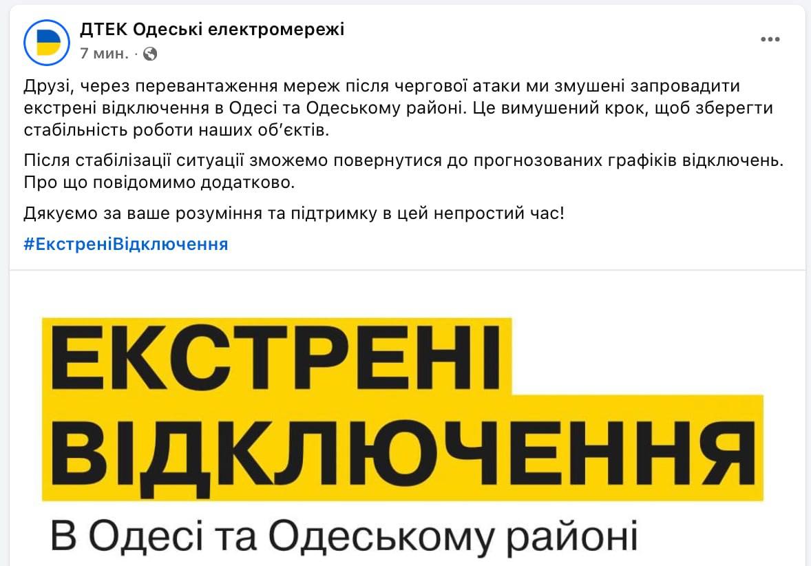 12:57 В Одесі та передмісті почалися екстрені відключення світла.