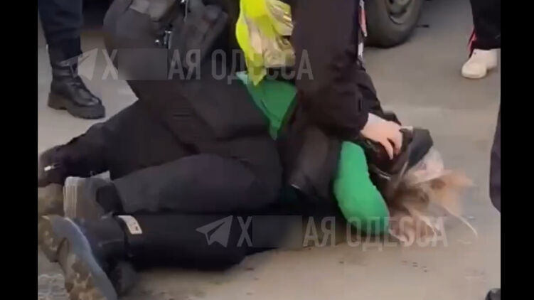 На одному із записів людина у формі валить одну із учасниць конфлікту на землю і намагається вдарити обличчям об асфальт.