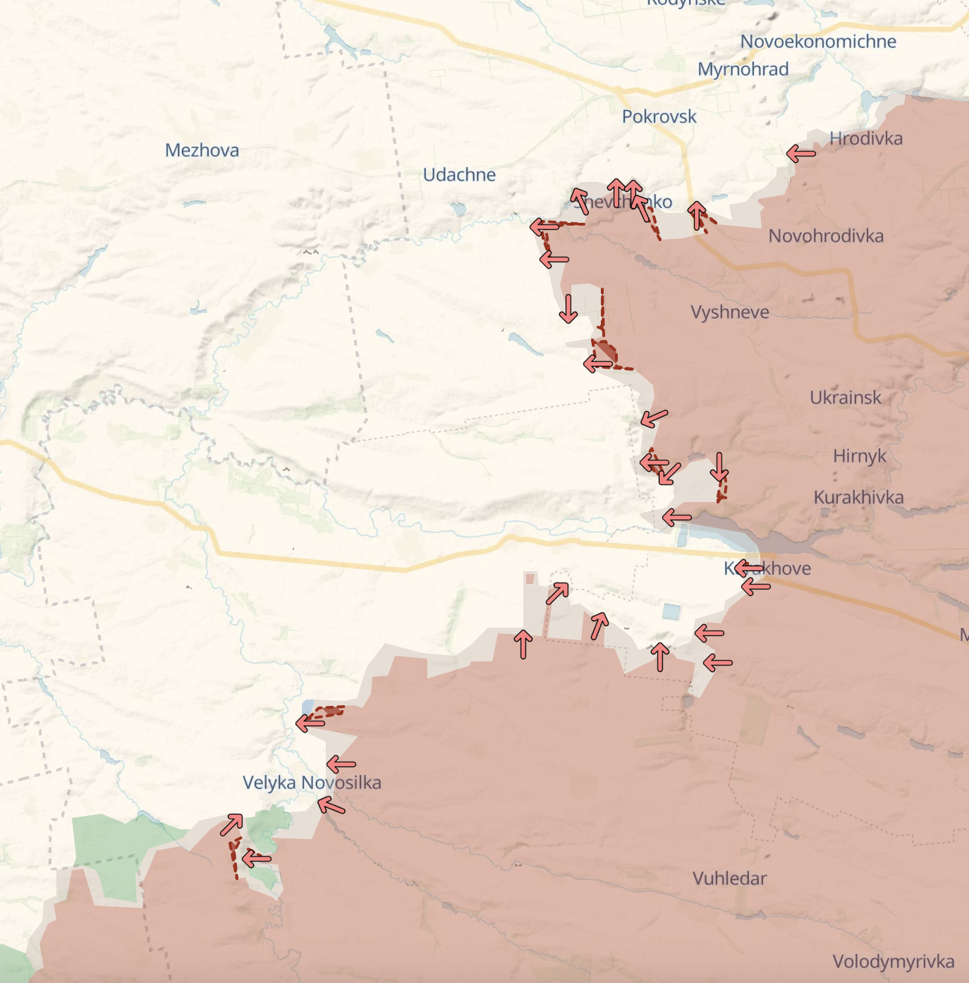 Росіяни знову просунулися під Покровськом, свідчить карта Deep State. Зокрема, є просування трасою з півдня у Даченському.