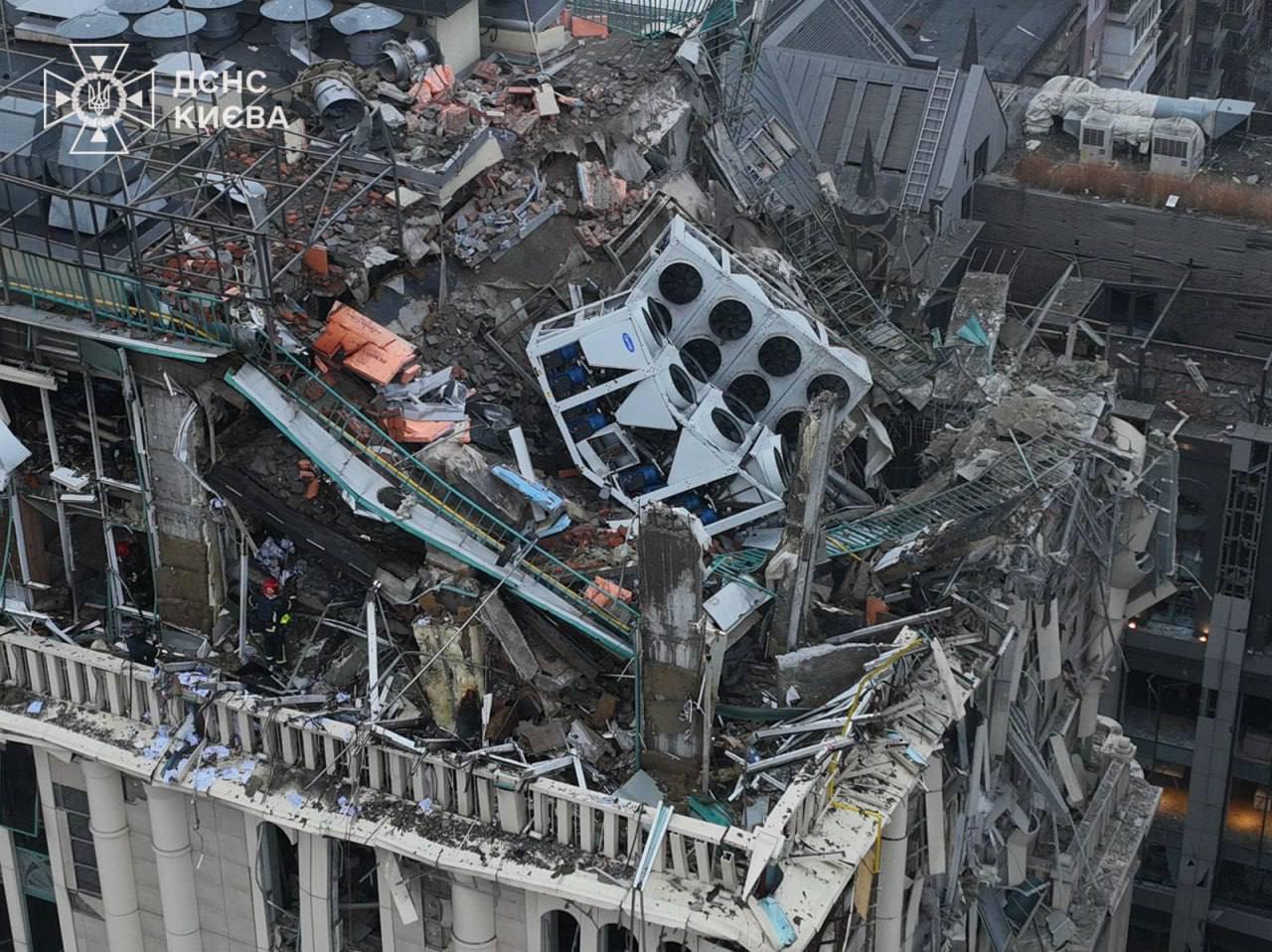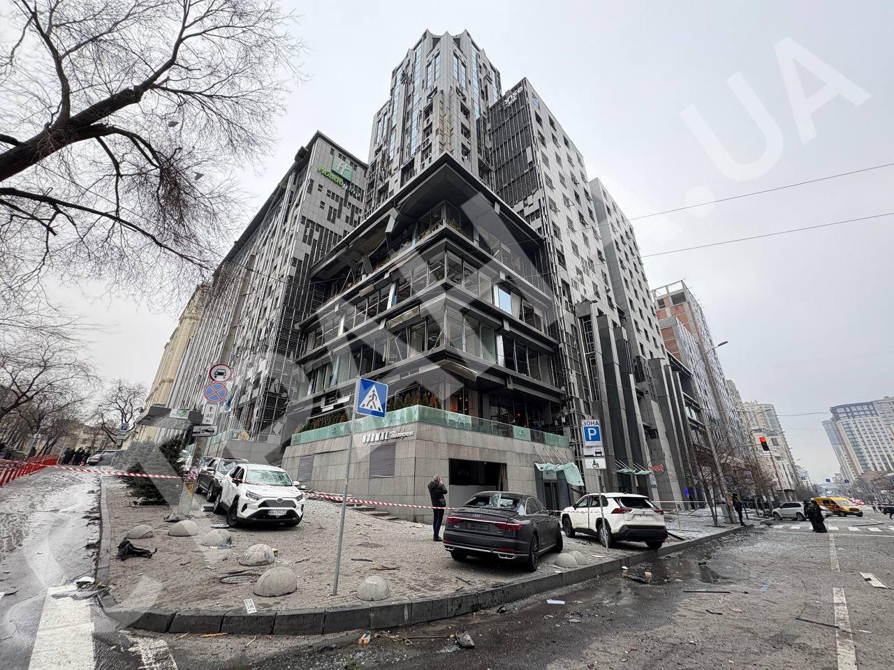 10:06 Наслідки ракетної атаки в готелі Holiday Kyiv, розташованому в БЦ "Торонто".