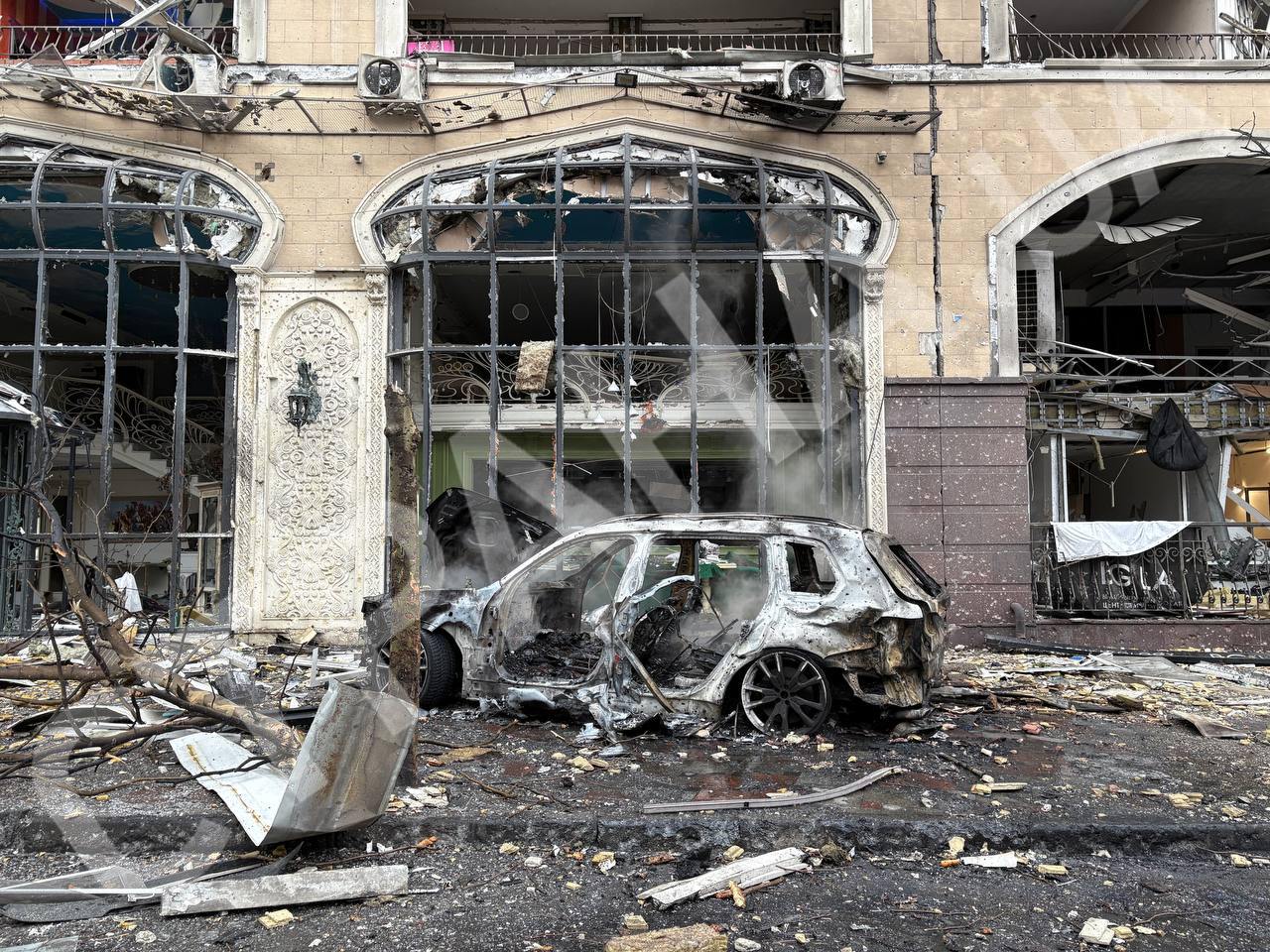 У готелі повністю вибито вікна, частково обвалилися частини фасаду будівлі, евакуйовано близько 100 осіб.