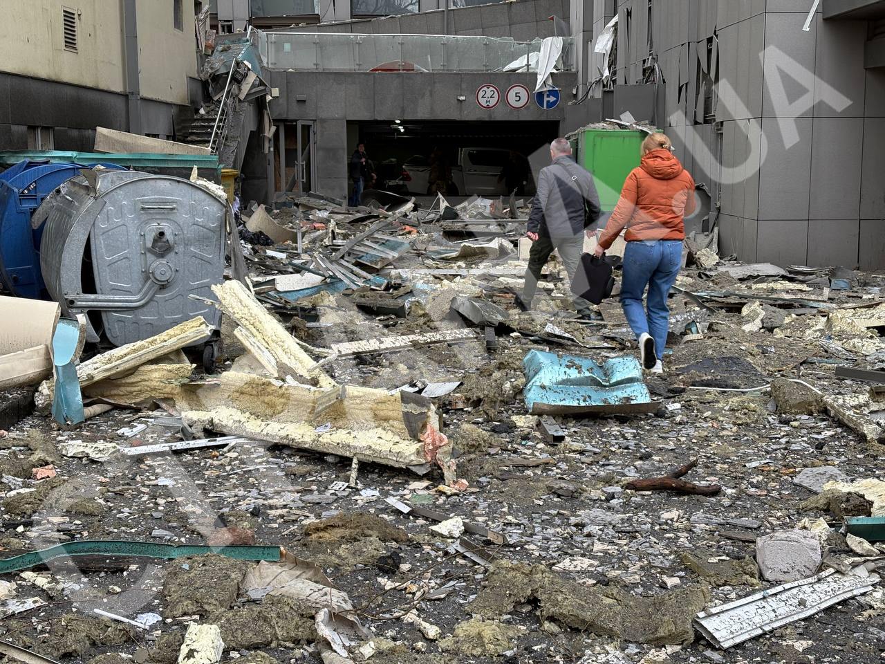 Частково зруйновано фасад бізнес-центру біля метро. Сама станція не постраждала.