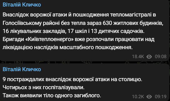 09:22 У Києві один загиблий та 9 постраждалих внаслідок нічної ракетної атаки, повідомляє мер Віталій Кличко.