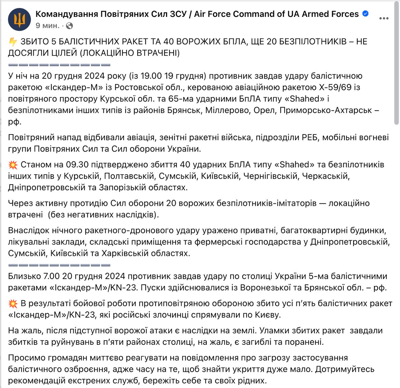 Також пишуть про збиття 40 "Шахедів" із 65. Ще 20 "локаційно втрачено".