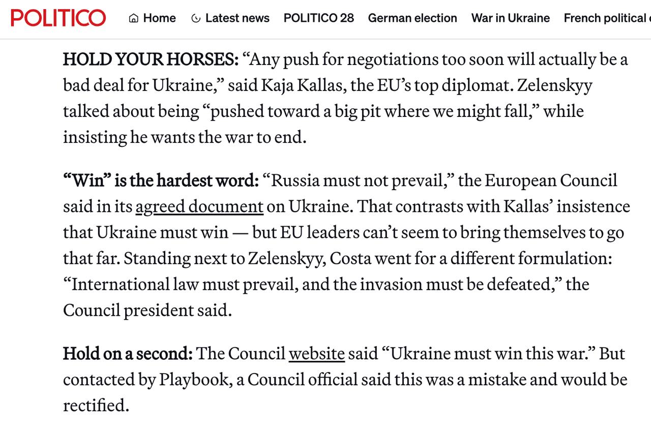 "На сайті Ради йдеться: "Україна має виграти цю війну". Однак, зв'язавшись із Playbook (розділ Politico - Ред.), представник Ради сказав, що це помилка, і вона буде виправлена", - пише видання.