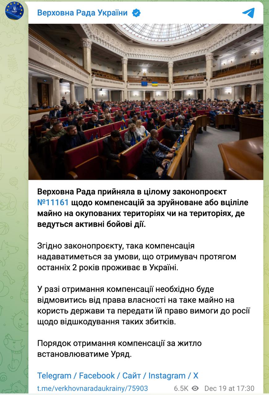Верховна Рада ухвалила загалом законопроект про компенсації, за яким отримати їх зможуть ті, хто протягом останніх двох років проживає в Україні, повідомляє прес-служба парламенту.