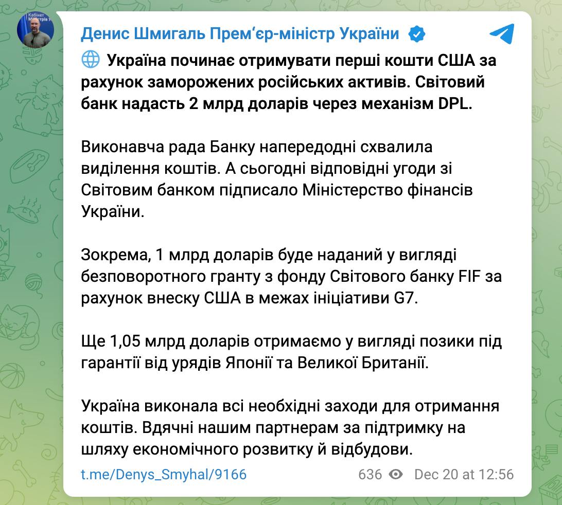 13:35 Україна починає одержувати перші гроші від США за рахунок заморожених російських активів, повідомляє прем'єр Денис Шмигаль.