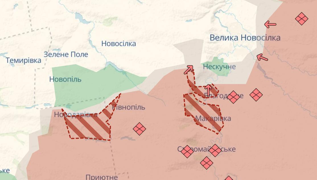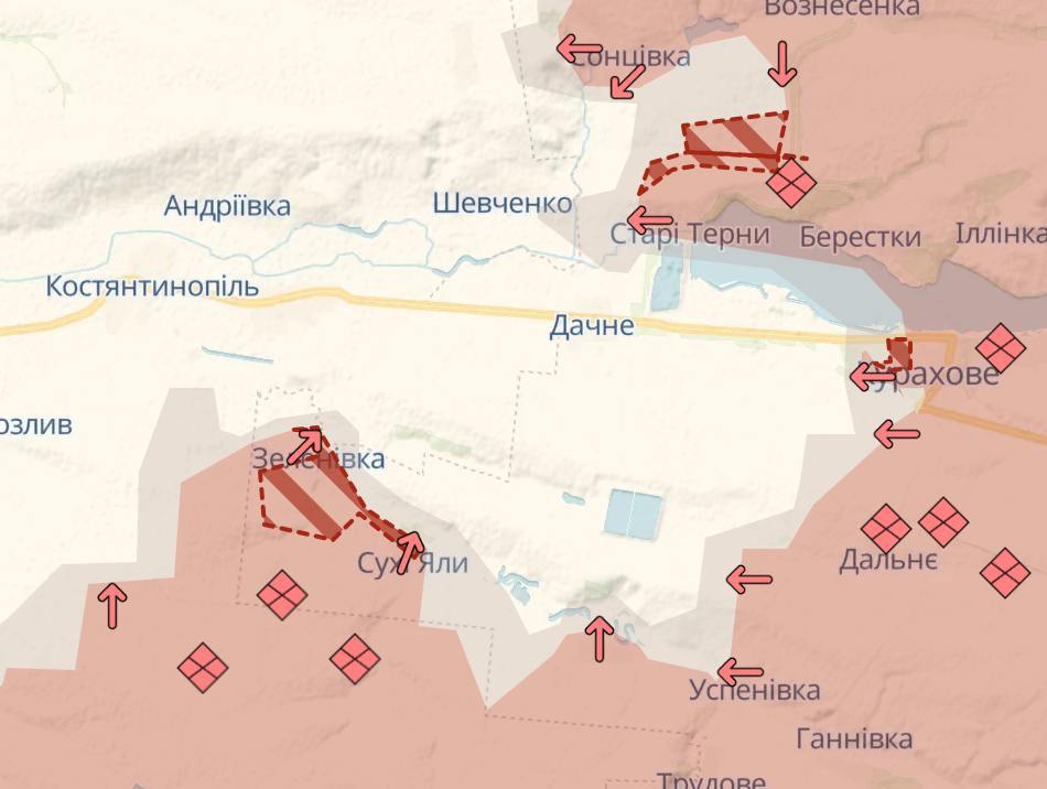 Також армія РФ просунулась у Курахово та під Покровськом. Зокрема, захоплено села Зеленівка та Сухі Яли під Кураховим.