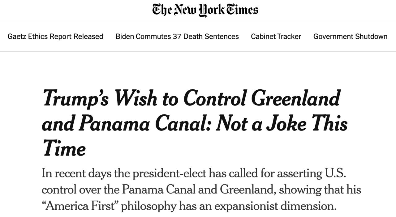 Заяви обраного президента США Дональда Трампа про бажання встановити контроль над Гренландією та Панамським каналом "на цей раз не жарт" і показують, що він вестиме Америку до експансіонізму.