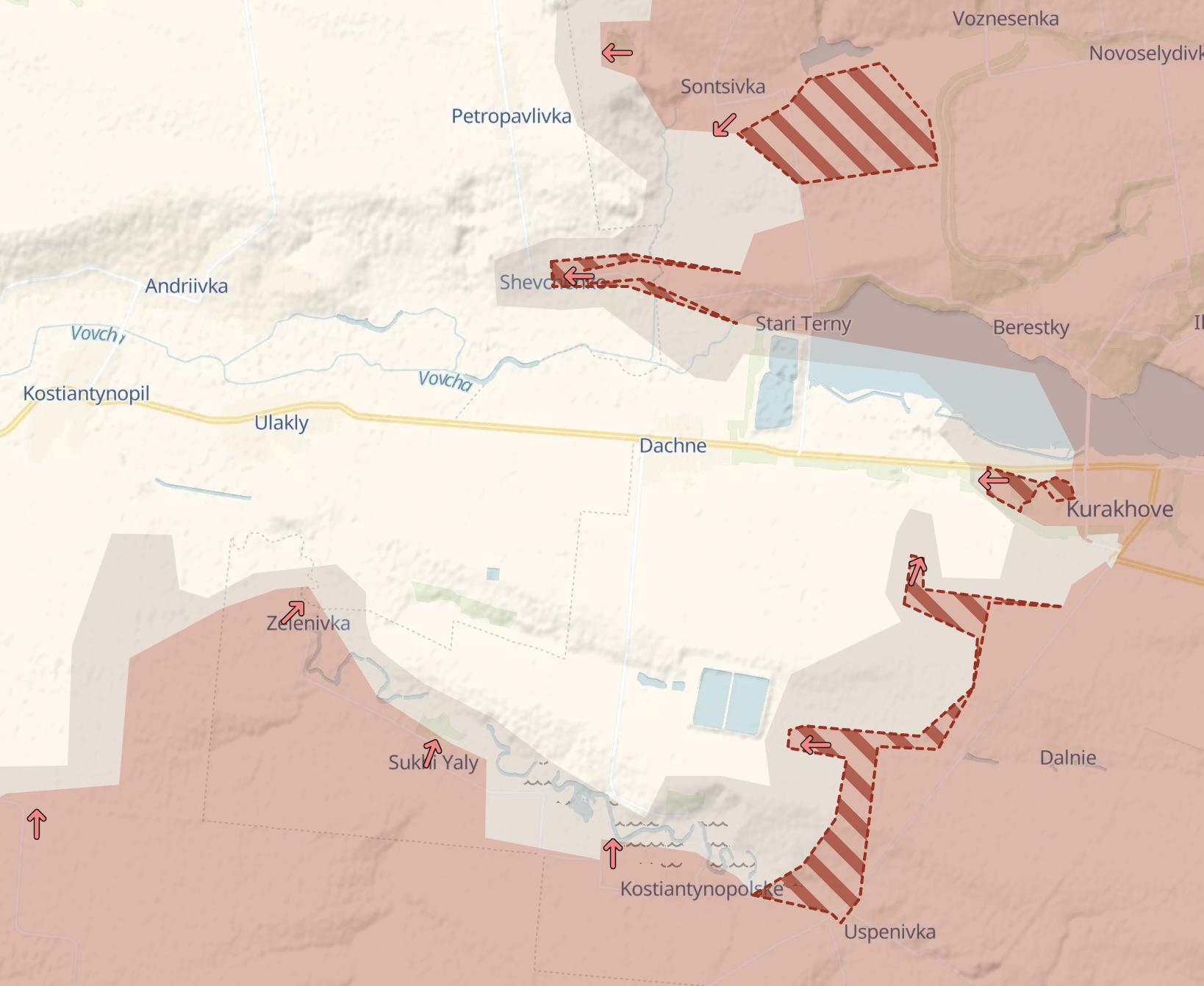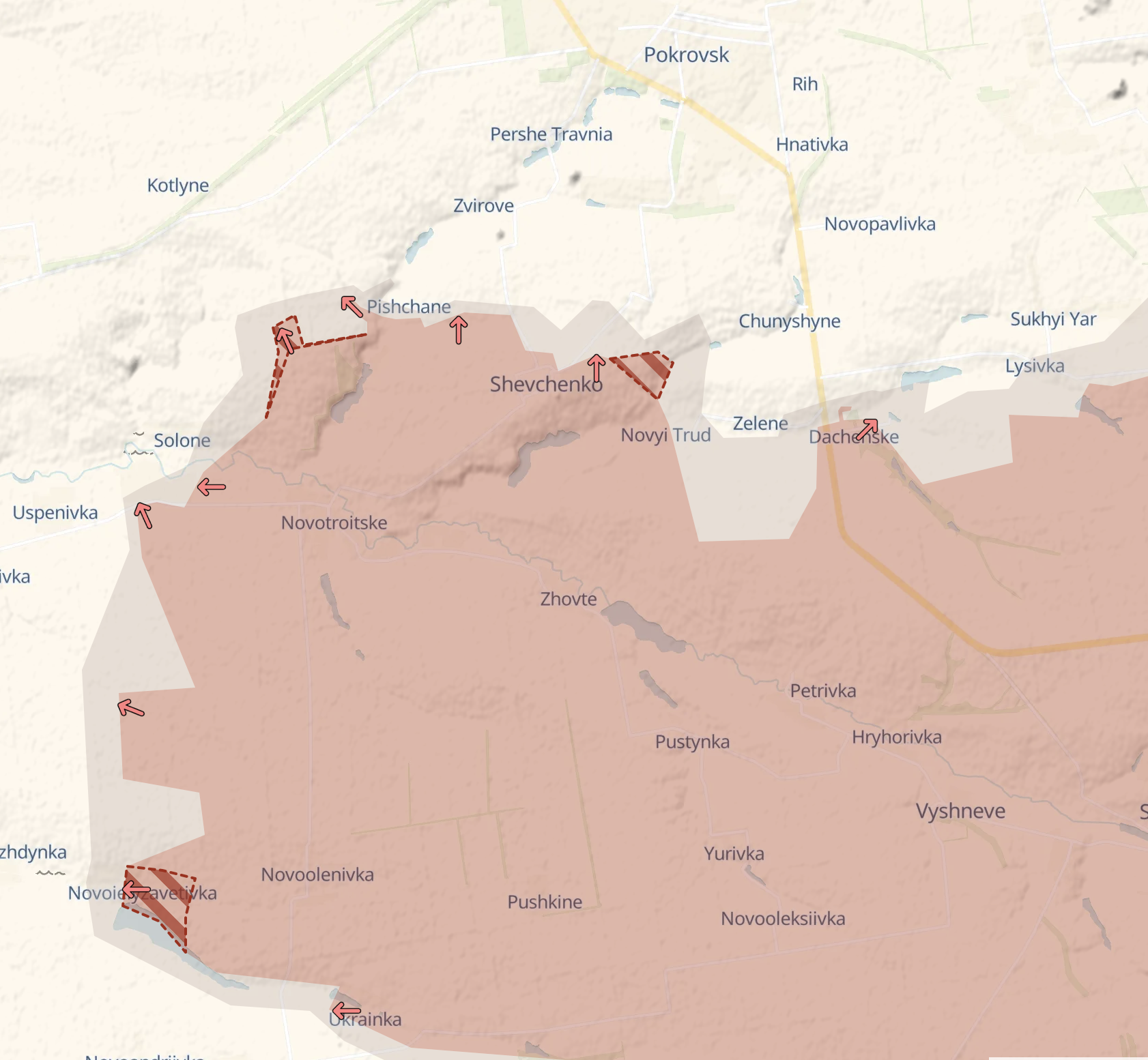 Безпосередньо на південь від Покровська російські війська пробиваються з боку Шевченка до залізничної станції Чунішино. До неї залишилося менше кілометра. Таким чином росіяни намагаються "зрізати" ділянку в районі Зеленого (між Новою Працею та Даченським).