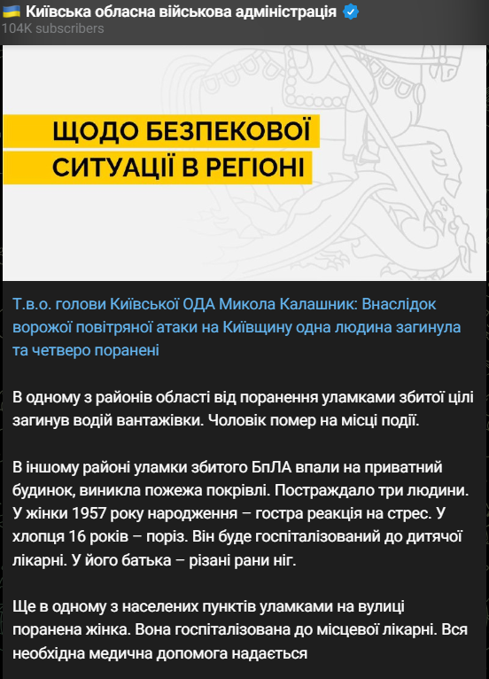 Київську область атакували "Шахеди". Загинув чоловік, ще чотири особи отримали поранення