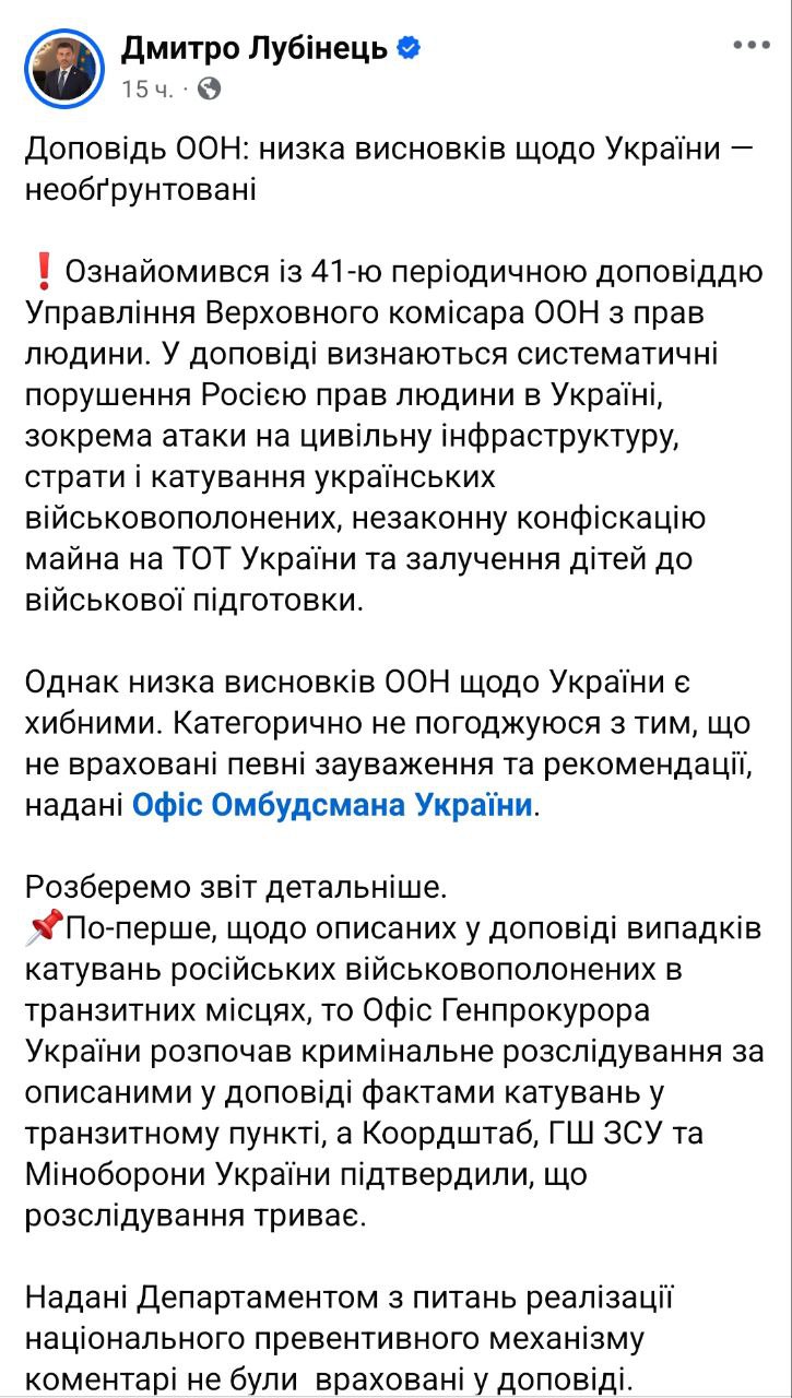 Уповноважений Верховної Ради України з прав людини Дмитро Лубинець розкритикував доповідь ООН про порушення прав людини в Україні за згадування тортур щодо російських військовополонених.