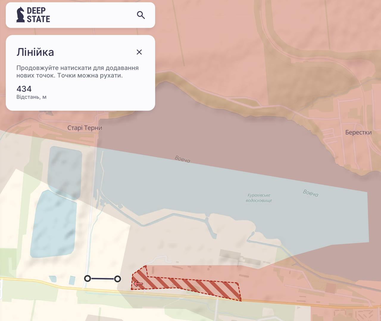 Російські пабліки заявляють, що їхні війська встановили прапор на західній околиці Курахового. Вони публікують кадри з геоприв'язкою, стверджуючи, що це місце на південь від Старих Тернів.