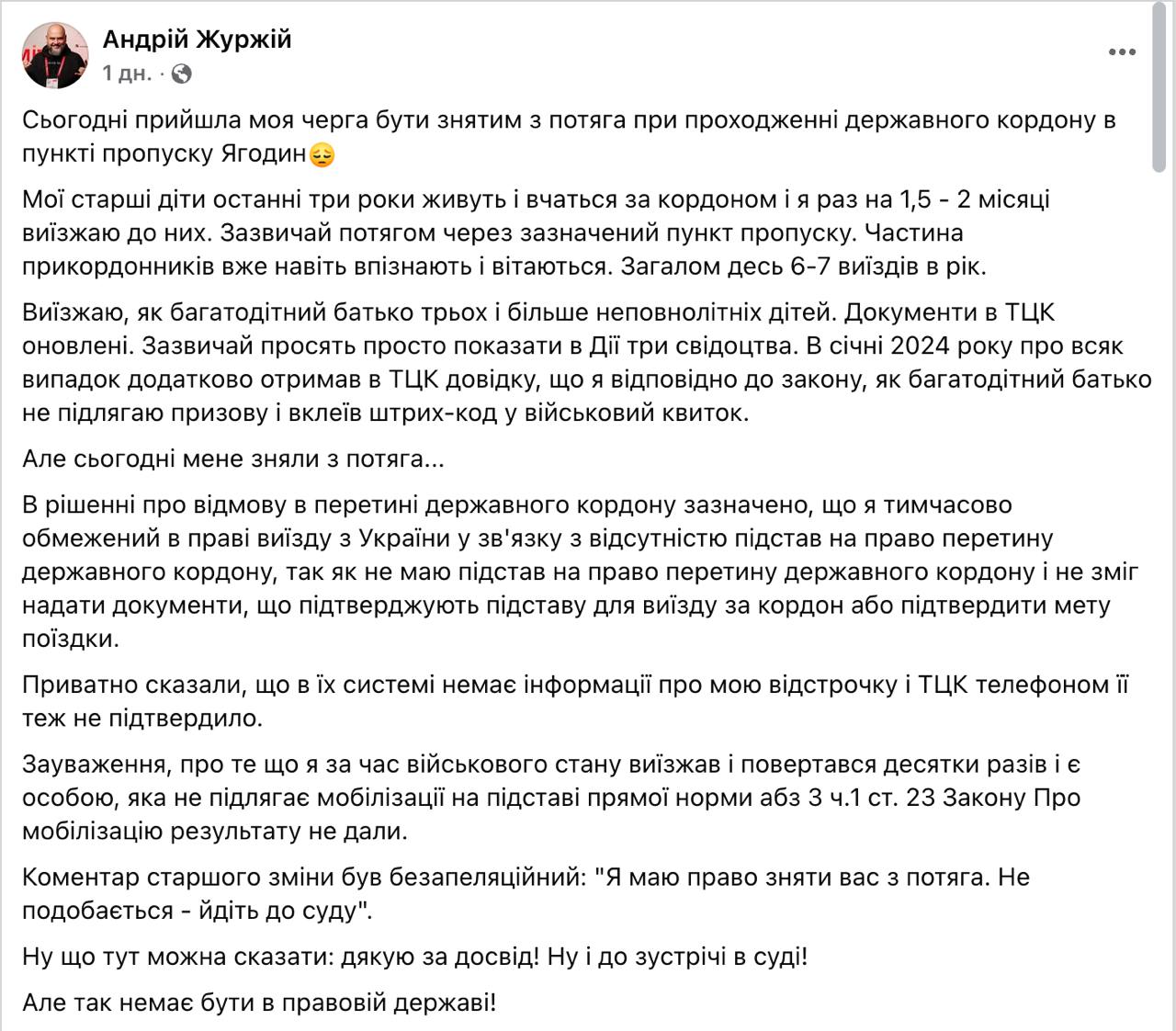 Він пише, що документи в ТЦК оновлені, довідка, що він не підлягає мобілізації, як багатодітний батько вклеєний у військовий квиток. Але його все одно зняли з поїзда.