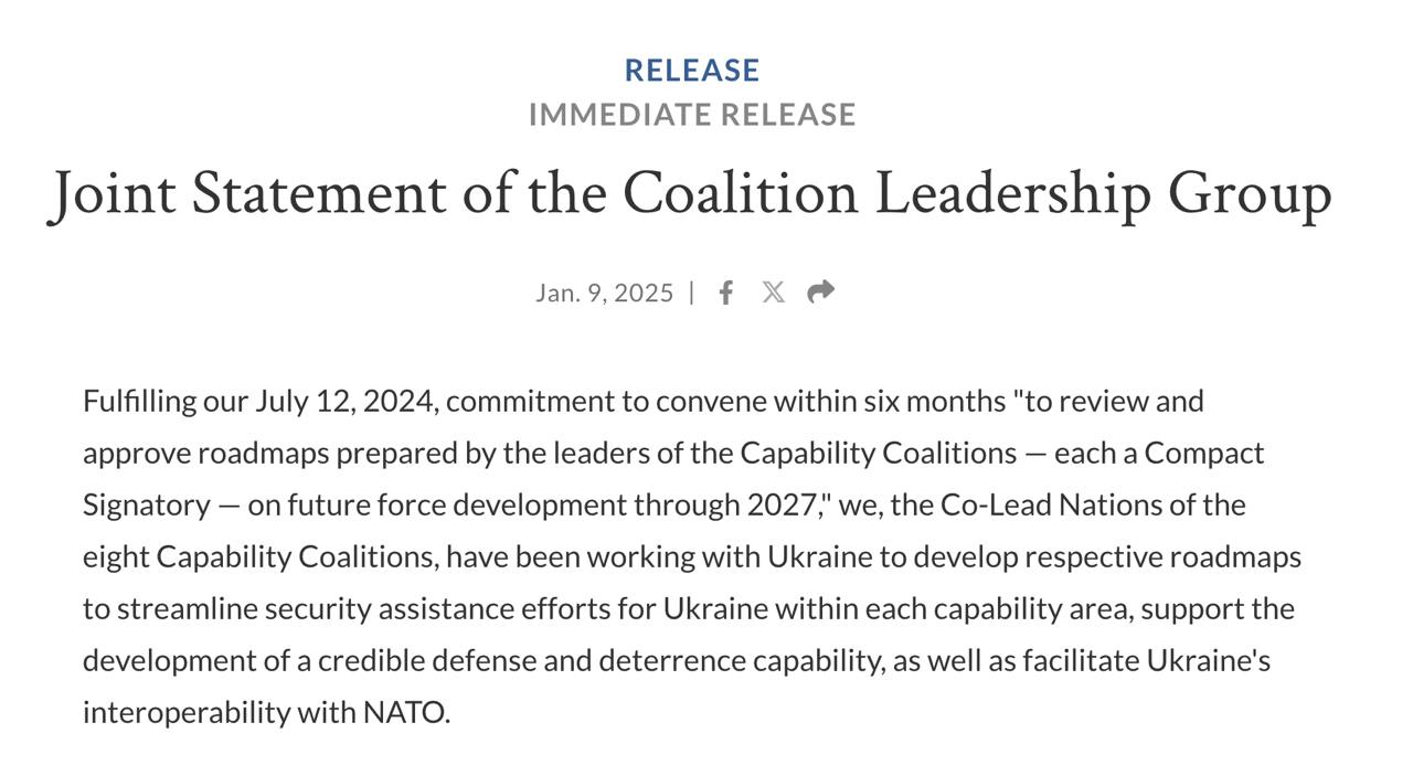 "Орієнтуючись на цільові показники потенціалу до 2027 року, наші країни планують тісно співпрацювати з Україною, щоб визначити, як досягти цих контрольних показників, збалансувавши потреби України як у воєнний час, так і в майбутньому через наші відповідні національні пожертвування, закупівлі, інвестиції та зусиль щодо розширення потенціалу оборонної промислової бази, у тому числі за рахунок використання можливостей виробництва та підтримки національної оборонної промисловості України", - йдеться у повідомленні.