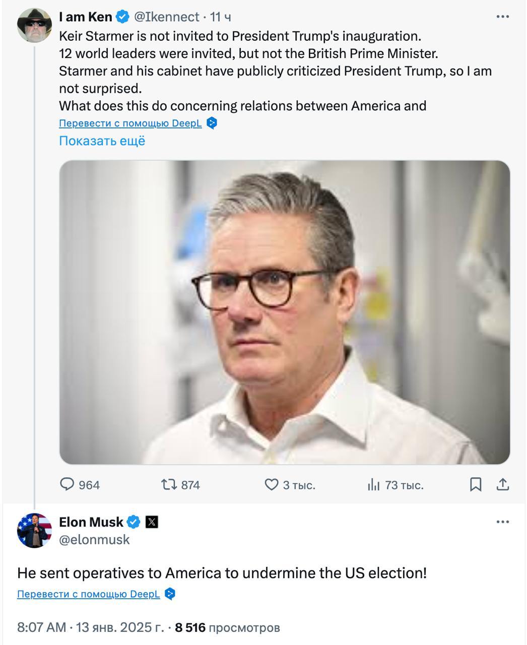 Так підприємець із команди обраного президента США Дональда Трампа прокоментував публікацію в Х про те, що Стармера не запросили на інавгурацію.