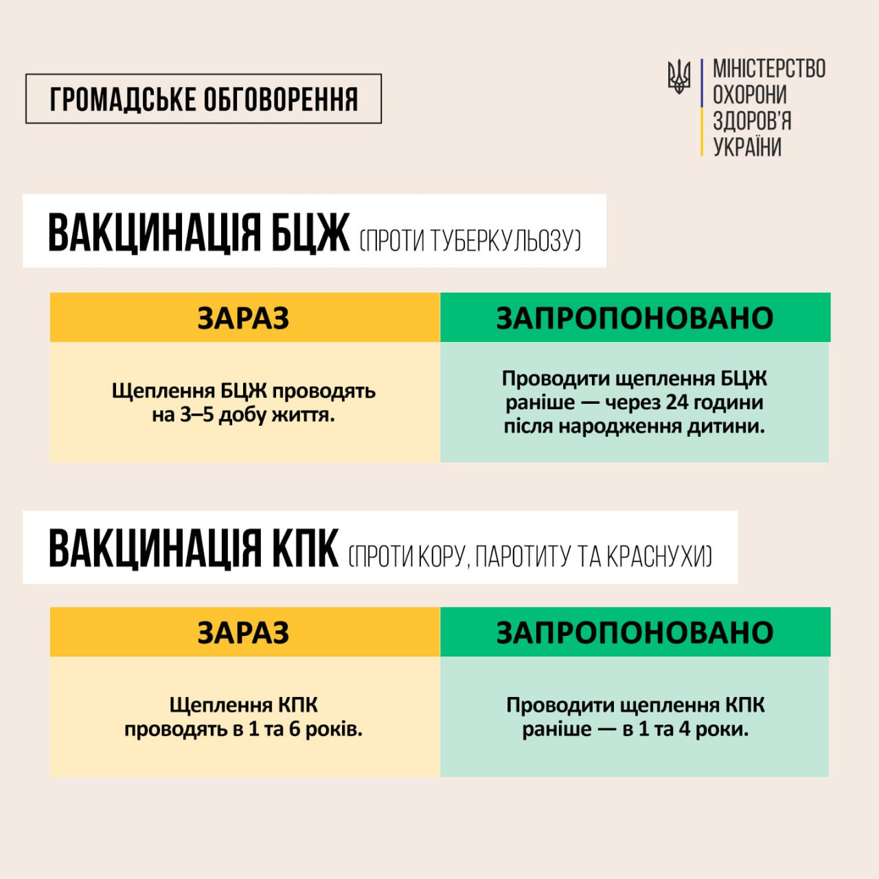 - перегляд часу вакцинації проти туберкульозу - замість щеплення БЦЖ на 3-5-ту добу життя щеплюватимуть у першу добу після появи на світ;