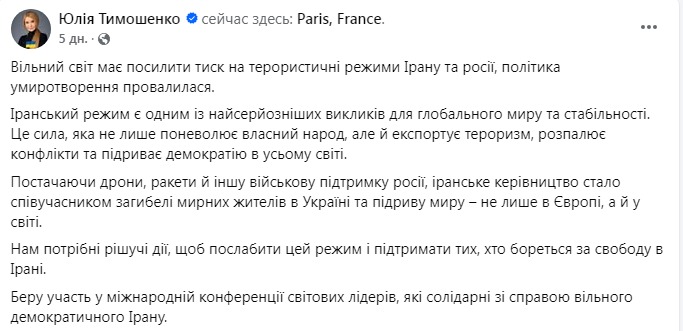 "Вільний світ має посилити тиск на терористичні режими Ірану та росії, політика умиротворення провалилася. Іранський режим є одним із найсерйозніших викликів для глобального миру та стабільності. Це сила, яка не лише поневолює власний народ, але й експортує тероризм, розпалює конфлікти та підриває демократію в усьому світі. Постачаючи дрони, ракети й іншу військову підтримку росії, іранське керівництво стало співучасником загибелі мирних жителів в Україні та підриву миру – не лише в Європі, а й у світі. Нам потрібні рішучі дії, щоб послабити цей режим і підтримати тих, хто бореться за свободу в Ірані. Беру участь у міжнародній конференції світових лідерів, які солідарні зі справою вільного демократичного Ірану", - написала Тимошенко.