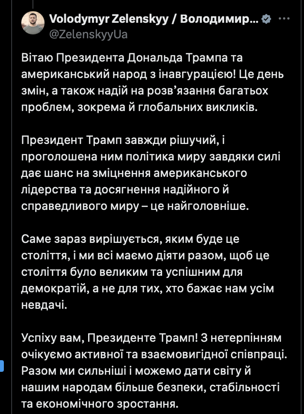 Він заявив, що Трамп проголосив "політику світу завдяки силі" (сам президент США такого формулювання не використав), що дає шанс на "досягнення надійного та справедливого світу". "З нетерпінням чекаємо на активну та взаємовигідну співпрацю", - додав Зеленський.