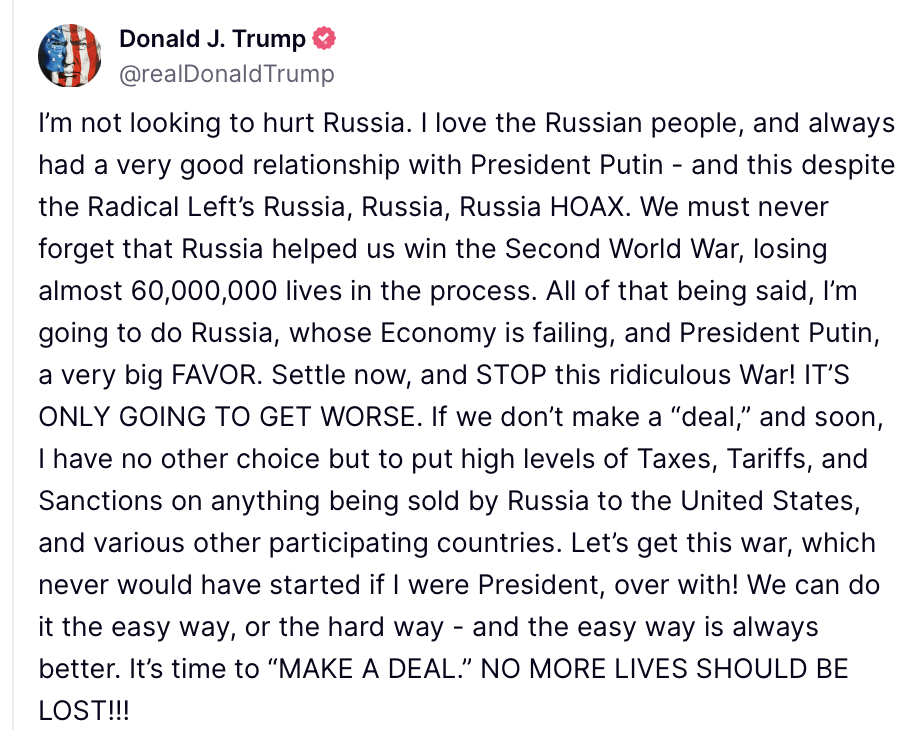 "Я збираюся зробити для Росії, чия економіка зазнає краху, і для президента Путіна дуже велика послуга. Давайте укладемо угоду зараз і зупинимо цю безглузду війну! Далі буде тільки гірше. Якщо ми не досягнемо угоди найближчим часом, у мене не залишиться. іншого вибору, окрім як запровадити високі податки, тарифи та санкції на все, що Росія продає до Сполучених Штатів та інших країн, які беруть участь у цьому процесі", - написав Трамп у себе в соцмережі.