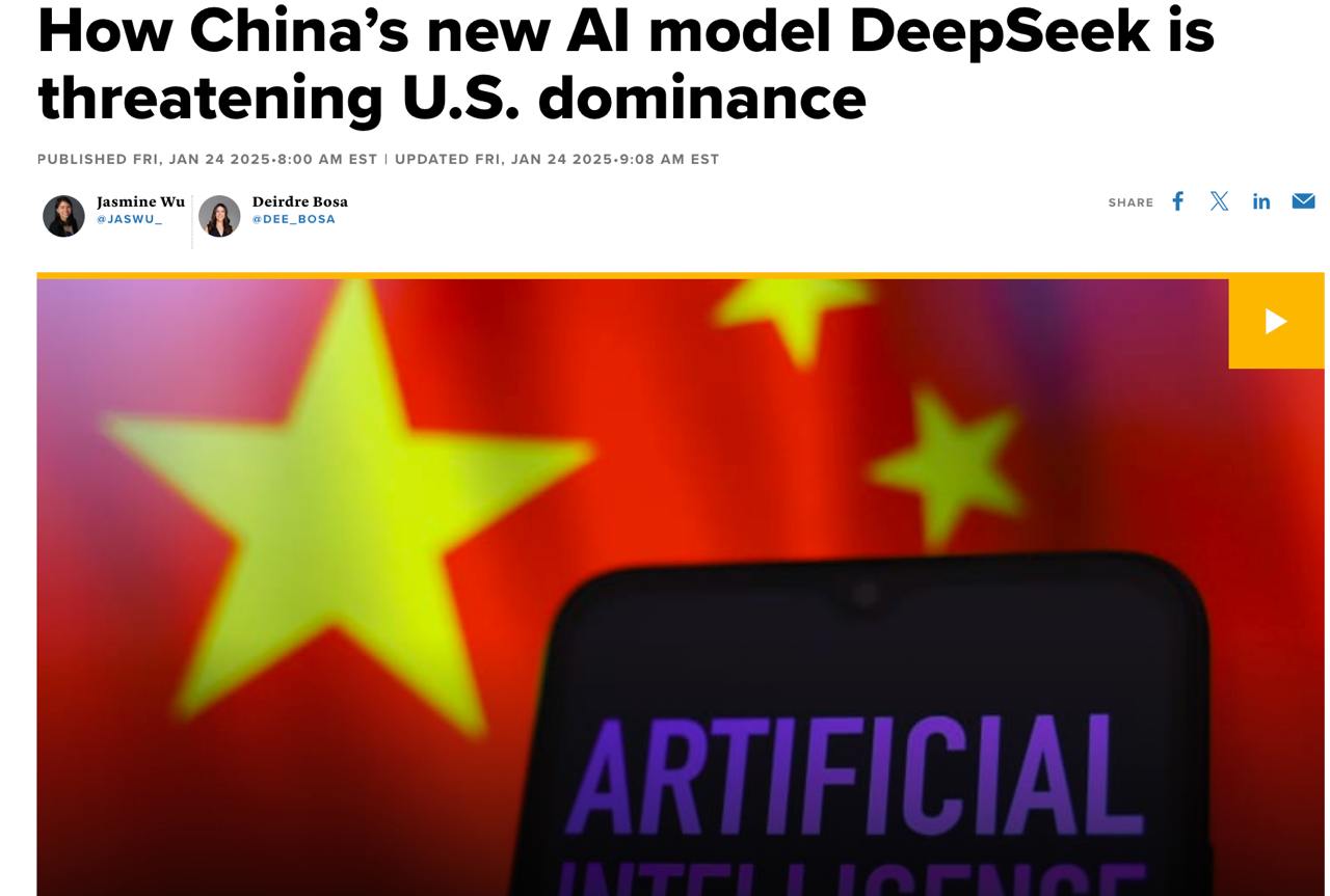 Нові розробки Китаю "викликали тривогу щодо скорочення глобального лідерства Америки в галузі штучного інтелекту". Також вони "поставили під сумнів величезні витрати великих технологічних компаній на створення моделей штучного інтелекту та центрів обробки даних".
