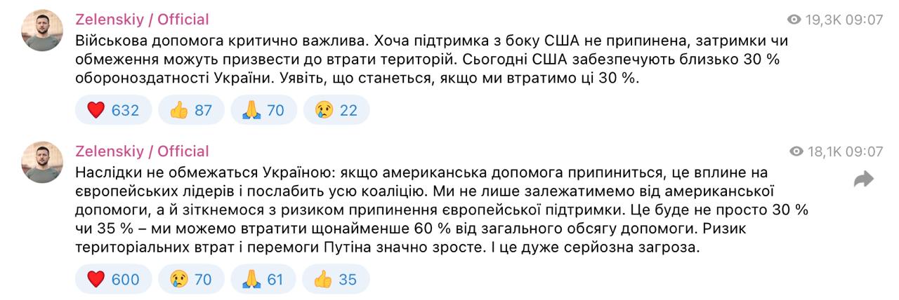 "Якщо американська допомога припиниться, це вплине на європейських лідерів і послабить всю коаліцію. Ми будемо не тільки залежати від американської допомоги, але й зіткнемося з ризиком припинення європейської підтримки. Це буде не просто 30% або 35% - ми можемо втратити не менше 60% загального обсягу допомоги. Ризик територіальних - Ризик територіальних".
