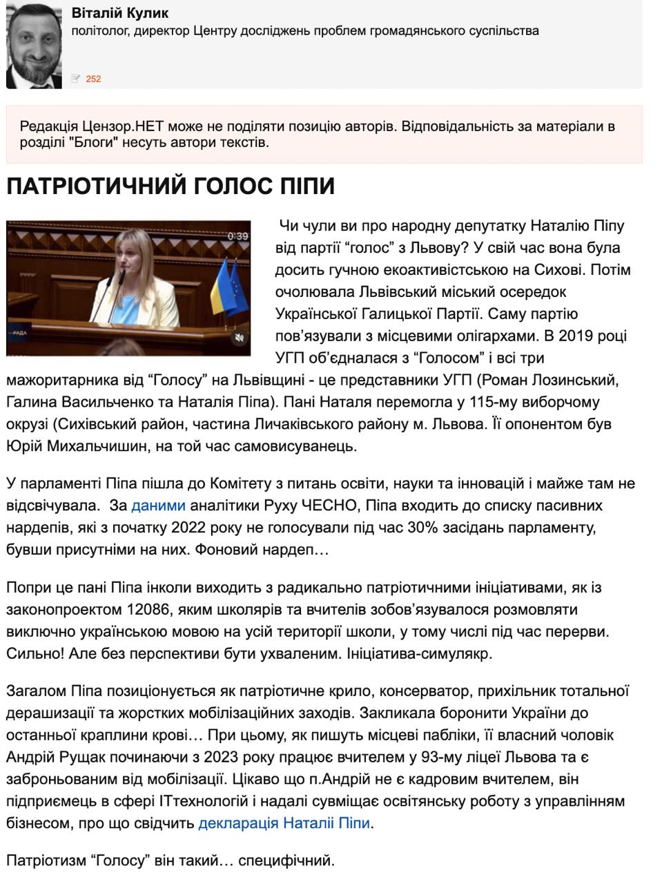 Чоловік народного депутата Наталії Піпи Андрій Рущак з 2023 року має броню від мобілізації, бо працює вчителем у 93-му ліцеї Львова. При цьому насправді кадровим учителем він не є.