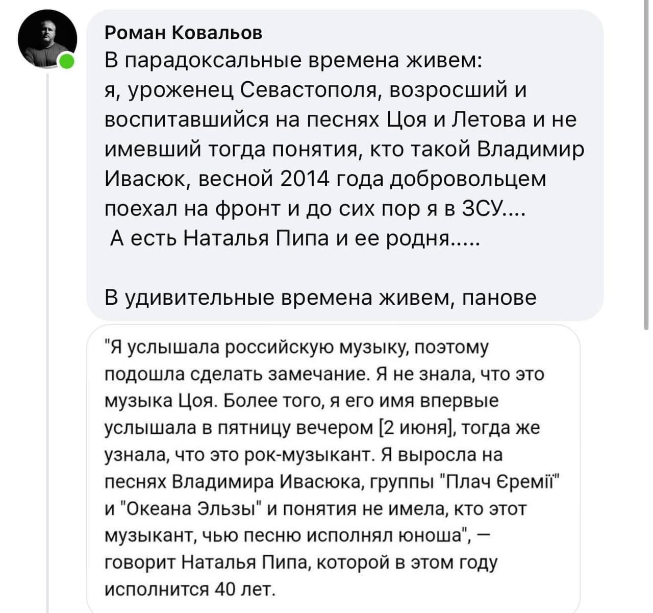 "У парадоксальні часи живемо: я, уродженець Севастополя, який виріс і виховався на піснях Цоя і Лєтова, який не мав тоді поняття, хто такий Володимир Івасюк, навесні 2014 року добровольцем поїхав на фронт і досі до ЗСУ. А є Наталія Піпа та її рідня", - сказав він.