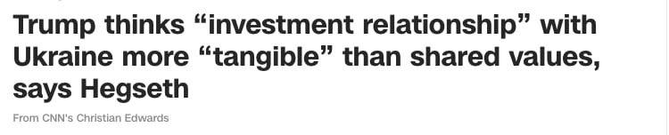 "Президент Трамп як переговорник і бізнесмен визнає, що інвестиційні відносини з Україною в кінцевому підсумку в довгостроковій перспективі для Сполучених Штатів набагато більш відчутні, ніж будь-які обіцянки або спільні цінності, які у нас можуть бути навіть якщо вони у нас є", - сказав Хегсет на брифінгу в Брюсселі.