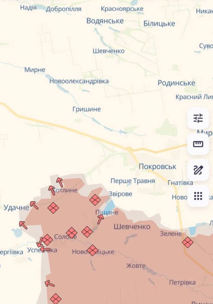Про атаки ЗСУ на Піщане повідомлялося ще минулого тижня. Зрозуміло, вони мають на меті вийти в тил російським військам на виступі на захід від Покровська в районі Вдалого і Котліно, щоб потім цей виступ зрізати.