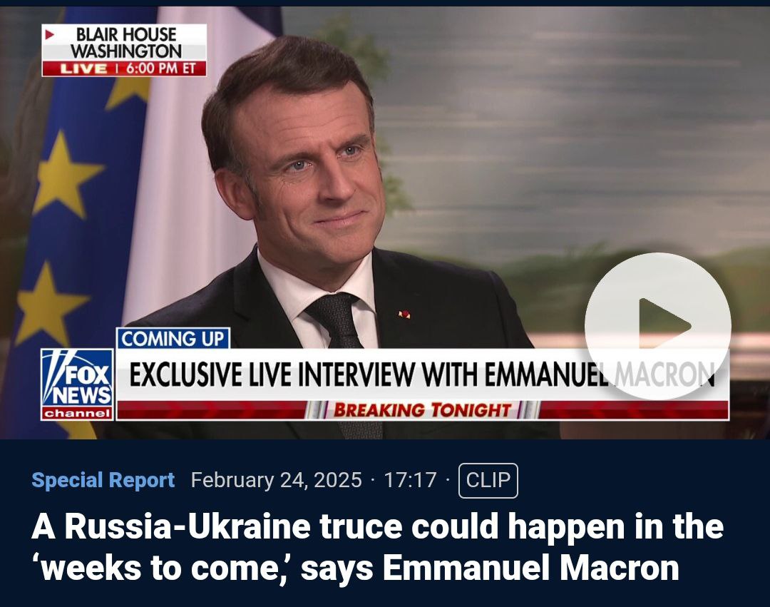 8.00 Макрон сподівається, що перемир'я між Україною та Росією може настати найближчими тижнями.