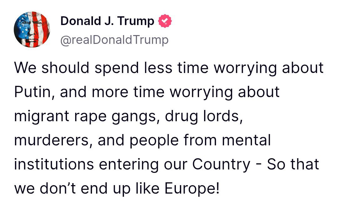 "Нам слід менше хвилюватися про Путіна і більше турбуватися про банди ґвалтівників-мігрантів, наркобаронів, убивць і людей з психіатричних лікарень, які в'їжджають до нашої країни, - щоб ми не закінчили як Європа!" - написав президент США у своїй соцмережі Truth Social.