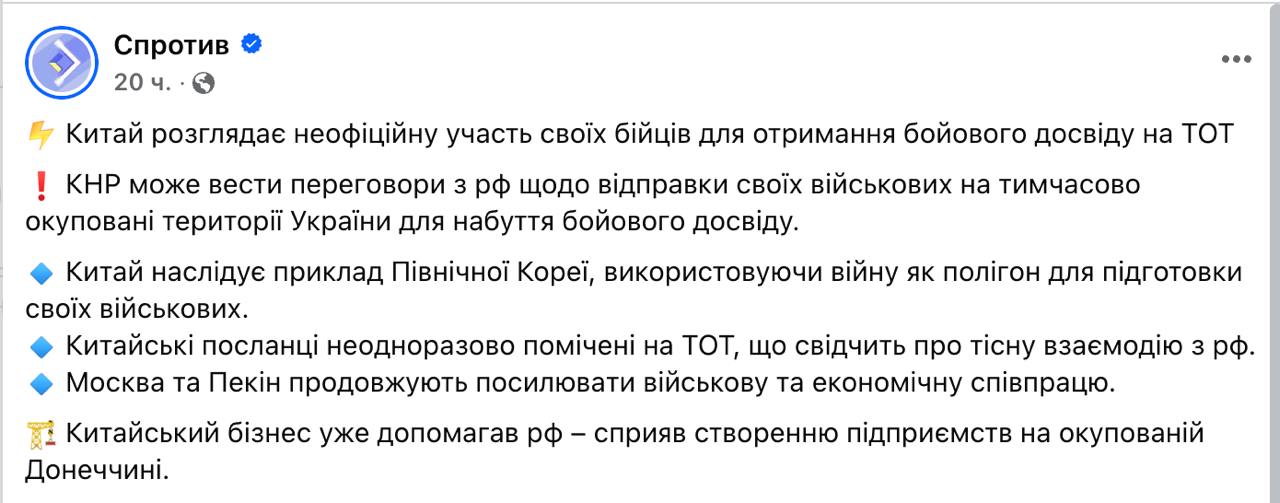 "Китай розглядає неофіційну участь своїх бійців для здобуття бойового досвіду на СОТ (тимчасово окупованих територіях - Ред. ). КНР може вести переговори з РФ щодо відправлення своїх військових на тимчасово окуповані території України для набуття бойового досвіду", - заявляє ЦНС.