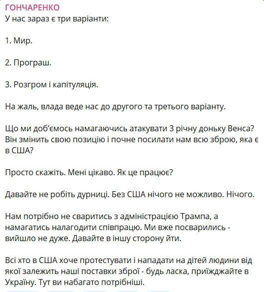 "Перший - мир, другий - програш, третій - розгром і капітуляція. На жаль, влада веде нас до другого і третього варіанту. Що ми доб'ємося намагаючись атакувати 3-річну дочку Венса? Він змінить свою позицію і почне посилати нам всю зброю, яка є в США? Просто скажіть..Нам потрібно не сваритися з адміністрацією Трампа, а намагатися налагодити співпрацю.