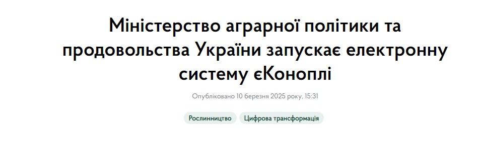З 10 березня Міністерство аграрної політики та продовольства України запускає електронну систему "єКоноплі". Її головна мета – удосконалення державної аграрної політики, відновлення лідерства України щодо вирощування технічних конопель та зниження можливих корупційних ризиків.
