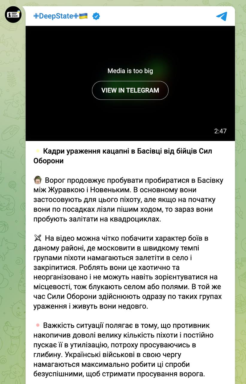 "Ворог продовжує пробувати пробиратися до Басівки між Журавкою та Новеньким. В основному вони застосовують для цього піхоту, але якщо спочатку вони по посадках лізли пішим ходом, то зараз вони намагаються залітати на квадроциклах", - пише український військовий паблік.