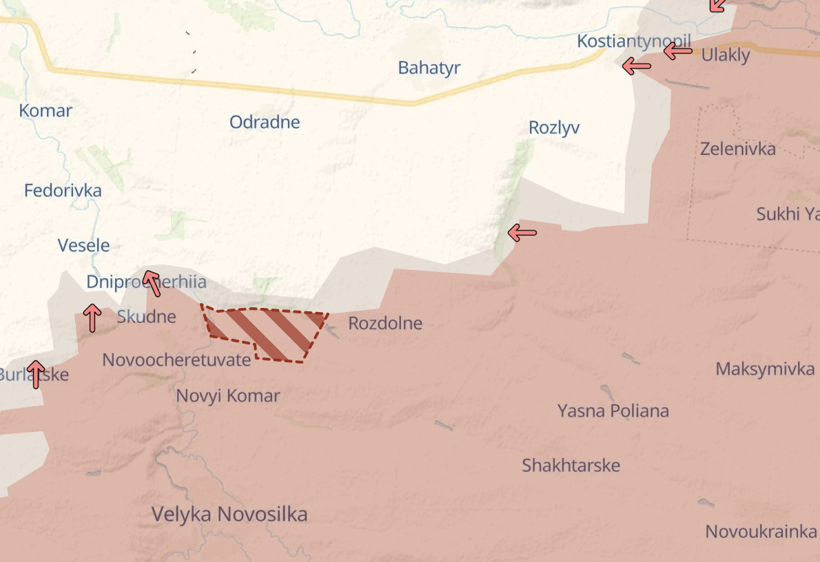 На Донбасі росіяни, за даними українського військового паблику DeepState, продовжують наступати на північ від Великої Новосілки та просунулися на ділянці між Дніпроенергією та Роздольним. Там до траси на Запоріжжі залишилося близько п'яти кілометрів.