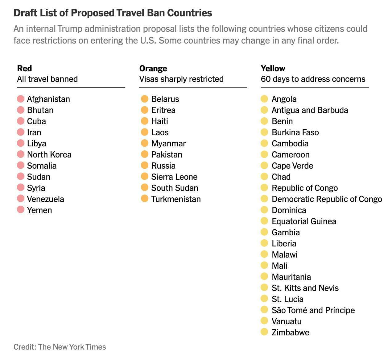 Співрозмовники NYT уточнюють, що список було складено кілька тижнів і перед тим, як він надійде на розгляд до Білого дому, туди з великою ймовірністю внесуть зміни, зокрема, щоб не ризикувати співпрацею з деякими країнами.