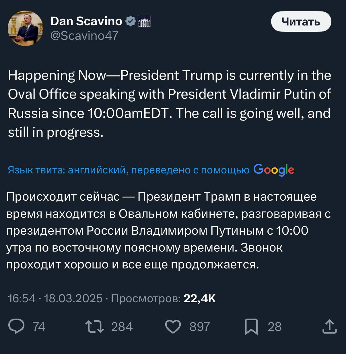 17:02 Розмова Путіна та Трампа вже йде, повідомив заступник голови апарату Білого дому Ден Скавіно.