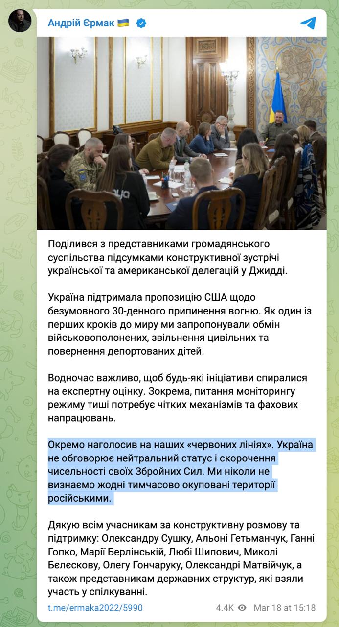 "Окремо відзначив наші "червоні лінії". Україна не обговорює нейтральний статус і скорочення чисельності своїх збройних сил. Ми ніколи не визнаємо жодні тимчасово окуповані території російськими", - заявив глава ВП на зустрічі з "представниками громадянського суспільства", на якій він "поділився підсумками конструктивної зустрічі української та американської делегацій".