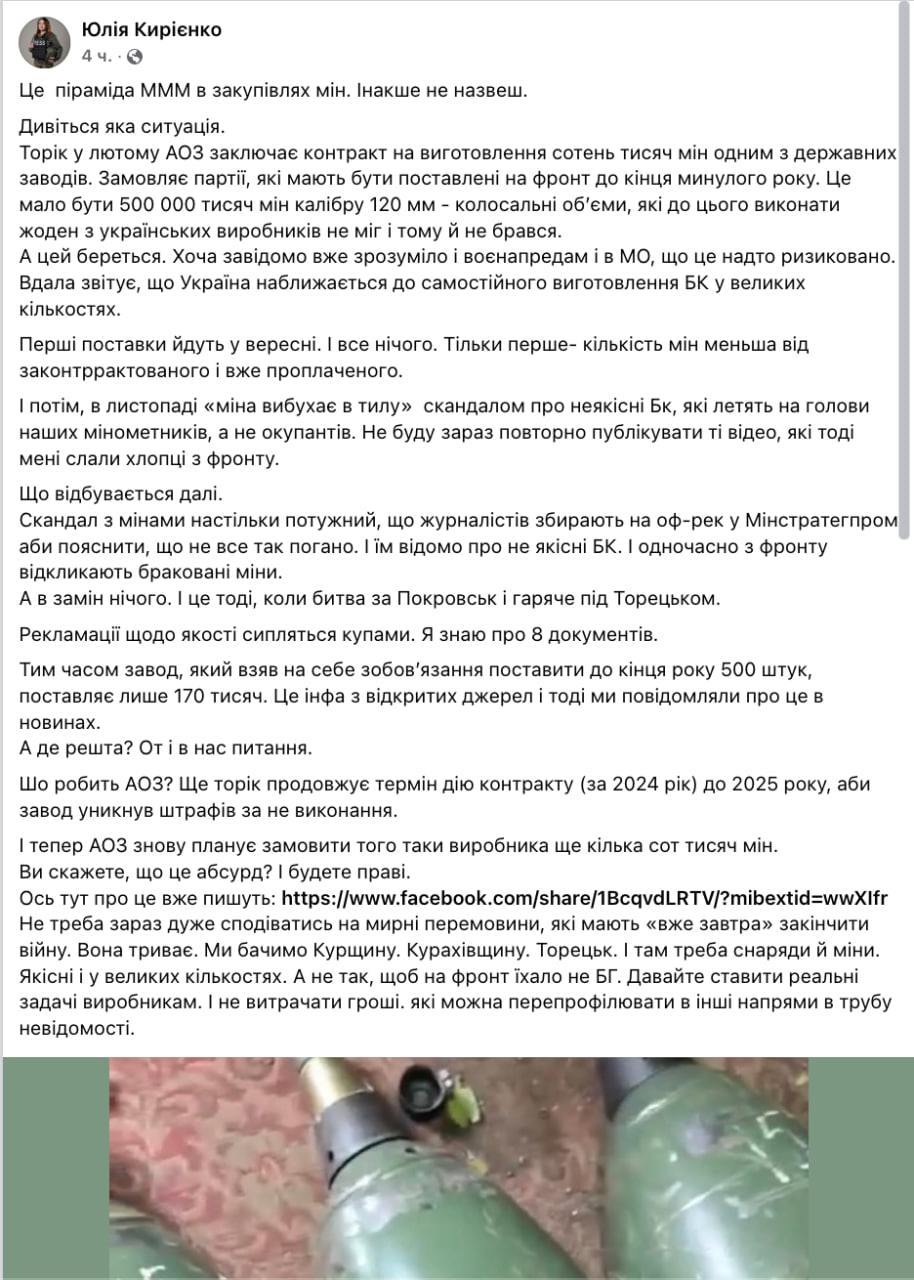 Як сказано в публікації, із 500 тисяч мін калібру 120-мм, які мали поставити ЗСУ до кінця року, державний завод передав лише 170 тисяч. Незважаючи на це, із заводом продовжили термін дії контракту на 2025 рік, "щоб завод уникнув штрафів за невиконання".