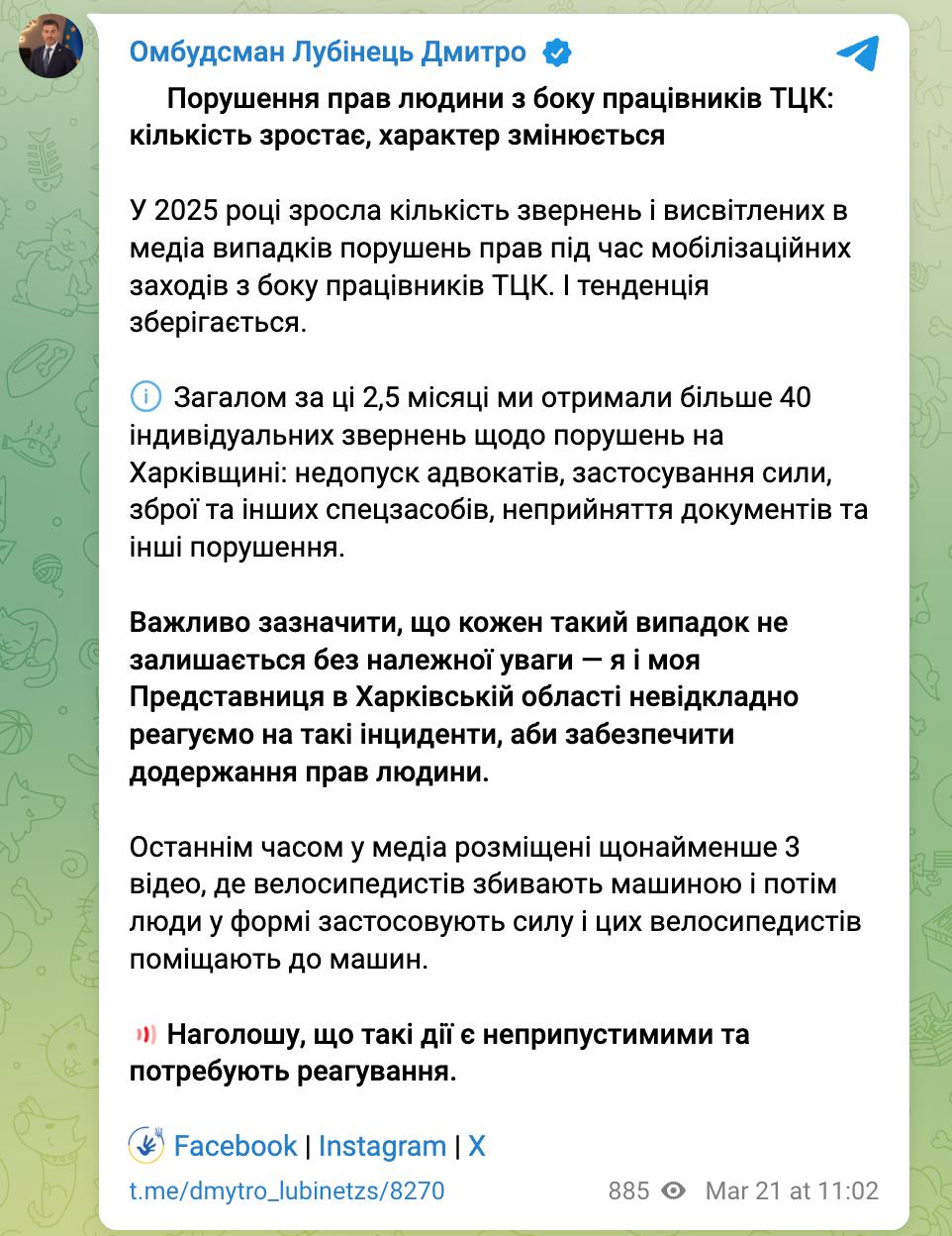 11:15 ТЦК стали частіше порушувати права людини під час мобілізації у 2025 році, повідомляє омбудсмен Дмитро Лубинець.