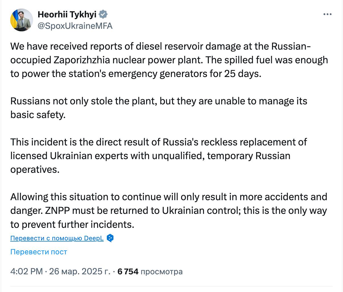 "Ми отримали повідомлення про пошкодження резервуару з дизельним паливом на окупованій Росією Запорізькій атомній електростанції. Розлитого палива вистачило на 25 днів роботи аварійних генераторів станції", - написав у речник МЗС Тихий.