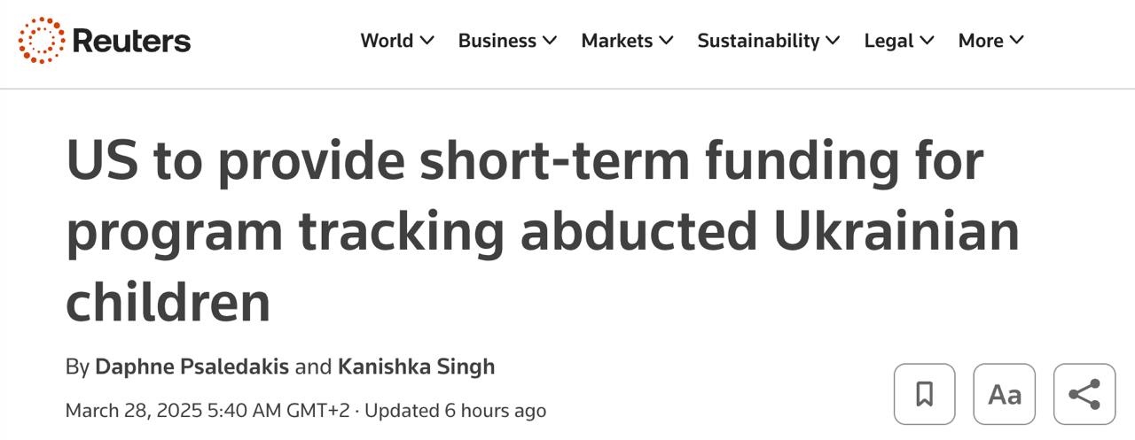 12:06 Держдеп США повідомив, що ненадовго продовжив фінансування програми з відстеження вивезених до Росії українських дітей, яка раніше була заморожена, передає Reuters.